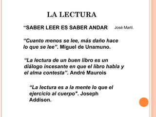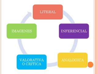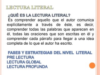 Este documento proporciona una introducción a la comprensión lectora. Explica que leer significa interactuar con un texto para comprenderlo e interpretarlo. Describe las diferentes formas de leer, como la prelectura, lectura global y lectura profunda. También cubre los diferentes niveles de comprensión lectora como literal, inferencial, analógico y crítico/valorativo. Finalmente, presenta algunas estrategias para desarrollar la comprensión lectora.