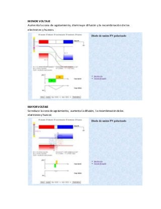 Este documento describe un simulador de un diodo de unión PN polarizado. Explica que la simulación considera las características de arrastre, recombinación, difusión, electrones y huecos del diodo. También describe cómo la corriente y las zonas de agotamiento se ven afectadas por la polarización directa e inversa del diodo.