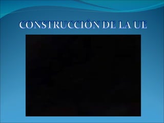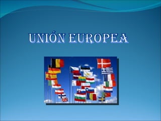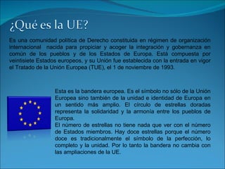 La Unión Europea es una organización internacional compuesta por 27 estados miembros europeos establecida para promover la integración y gobernanza común en Europa. La bandera europea representa la solidaridad y armonía entre los pueblos europeos con 12 estrellas doradas en un círculo sobre fondo azul. La UE se formó originalmente para prevenir futuros conflictos después de la Segunda Guerra Mundial y ha crecido progresivamente a través de ampliaciones y tratados para profundizar la cooperación económica y política.