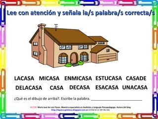 Este documento presenta una serie de ejercicios de lectura y escritura para niños en español. Cada página contiene una imagen y varias palabras o frases, y pide al lector que identifique cuáles son correctas o que forme frases con palabras seleccionadas. El objetivo es ayudar a los niños a practicar el reconocimiento y producción de palabras y oraciones simples.