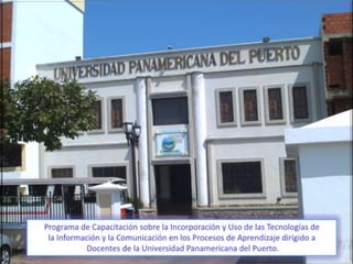 Este documento presenta la misión, visión, filosofía y valores de la Universidad Panamericana del Puerto. Su misión es formar recursos humanos y difundir el saber mediante actividades de investigación, extensión y servicios. Su visión es ser reconocida como una universidad de calidad por la formación de ciudadanos profesionales competentes. Su filosofía se basa en principios orientados al desarrollo del país. Sus valores incluyen la calidad, ética, respeto y responsabilidad social. El documento concluye resumiendo la situación actual