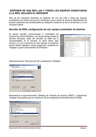 1) Se requiere una red LAN para conectar todos los equipos, incluido el servidor, ya que la autenticación de usuarios ahora se realiza a través de la red en el servidor. 2) El servidor controlador de dominio debe ser también un servidor DNS. 3) Tanto los servidores como los equipos clientes deben configurarse para utilizar al servidor controlador de dominio como servidor DNS primario.