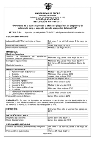La resolución aprueba la oferta de programas de pregrado y el calendario académico para el segundo período de 2013 en la Universidad de Sucre. Establece los programas disponibles, cupos, jornadas y modalidades (presencial y a distancia). También define las fechas para inscripción, matrícula, inicio de clases, reporte de notas y graduación.