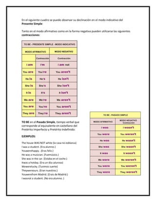 El documento presenta el abecedario en inglés con la pronunciación de cada letra. Luego, explica el uso del verbo "to be" en inglés para expresar ser y estar en presente, pasado y futuro. Finalmente, introduce la estructura "there to be" para hablar sobre la existencia de algo, y provee ejemplos para ilustrar su uso en forma afirmativa, negativa e interrogativa.