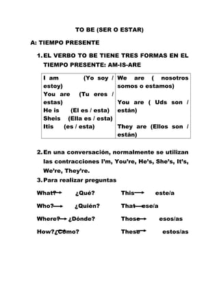 Este documento presenta las formas del verbo "to be" (ser o estar) en inglés en los tiempos presente, pasado y futuro, así como las expresiones "there to be" (haber o existir) en el tiempo presente. Explica las formas afirmativas, negativas e interrogativas de estos verbos y ofrece ejemplos para ilustrar su uso.