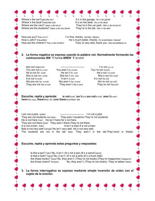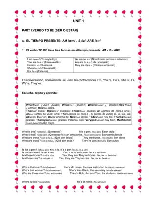 El documento presenta las formas del verbo "to be" (ser o estar) en inglés en los tiempos presente, pasado y futuro. En el tiempo presente, se explican las formas "am, is, are" y su uso con sujetos en singular y plural. También se incluyen ejemplos de preguntas y respuestas en el presente. En el tiempo pasado, se enseñan las formas "was, were" y su uso negativo. Finalmente, se describe la forma del futuro con "will be" y ejemplos de su uso.