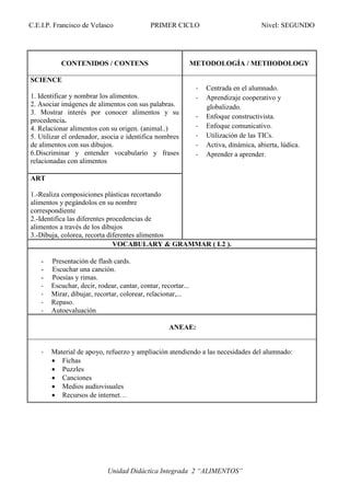 Este documento presenta una unidad didáctica sobre alimentos para estudiantes de segundo grado. La unidad se centra en objetivos como nombrar y asociar imágenes de alimentos, conocer su procedencia, y discriminar entre opciones saludables. Los estudiantes aprenderán a través de actividades prácticas como dibujar, recortar y pegar alimentos. La evaluación incluirá el reconocimiento de vocabulario relacionado y la participación en trabajos grupales.