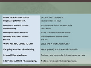 Este documento presenta información sobre el uso futuro con "be going to" y "will" en inglés. Explica que "be going to" se usa para planes ya decididos, mientras que "will" se usa con palabras como "maybe", "probably" para planes posibles antes de decidir. Luego proporciona ejemplos detallados de la estructura, formación y usos de "be going to" para expresar intenciones y predicciones basadas en evidencia presente.