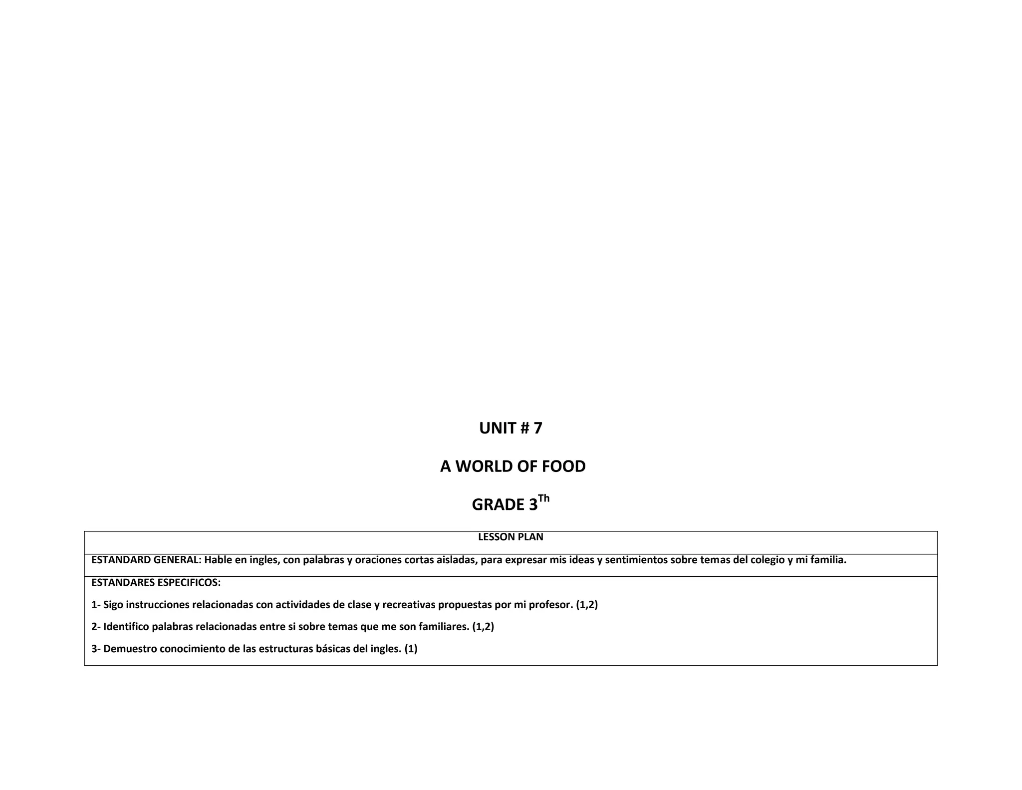 Este documento presenta dos planes de lección para una clase de inglés de tercer grado sobre el tema de la comida alrededor del mundo. El primer plan de lección se centra en identificar los gustos y disgustos de los estudiantes sobre diferentes alimentos a través de un juego y asociar nombres de comida con imágenes. El segundo plan se enfoca en completar oraciones con expresiones como "there is/there are" y describir preferencias de comida usando "I like" y "I don't like".