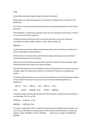 Existen diferentes tipos de palets según su función y materiales. La paletización permite ahorros en distribución al minimizar tiempos de carga y descarga, optimizar espacios de almacenamiento y carga, y reducir riesgos durante el transporte. El tipo y características del palet aseguran una buena gestión de la mercancía y distribución.