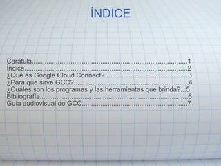 Este documento trata sobre Google Cloud Connect (GCC). Explica brevemente qué es GCC, para qué sirve al permitir conectar recursos locales con la nube de Google, y los programas y herramientas que brinda como crear, editar, compartir y guardar archivos. Incluye también una bibliografía e imágenes sobre el tema así como un video explicativo de GCC.