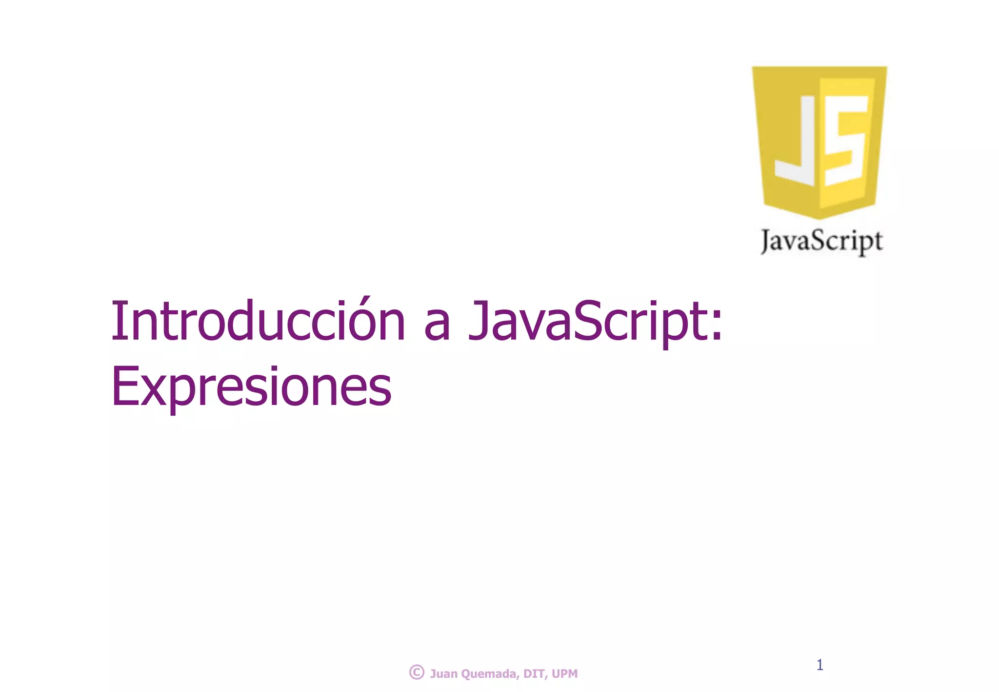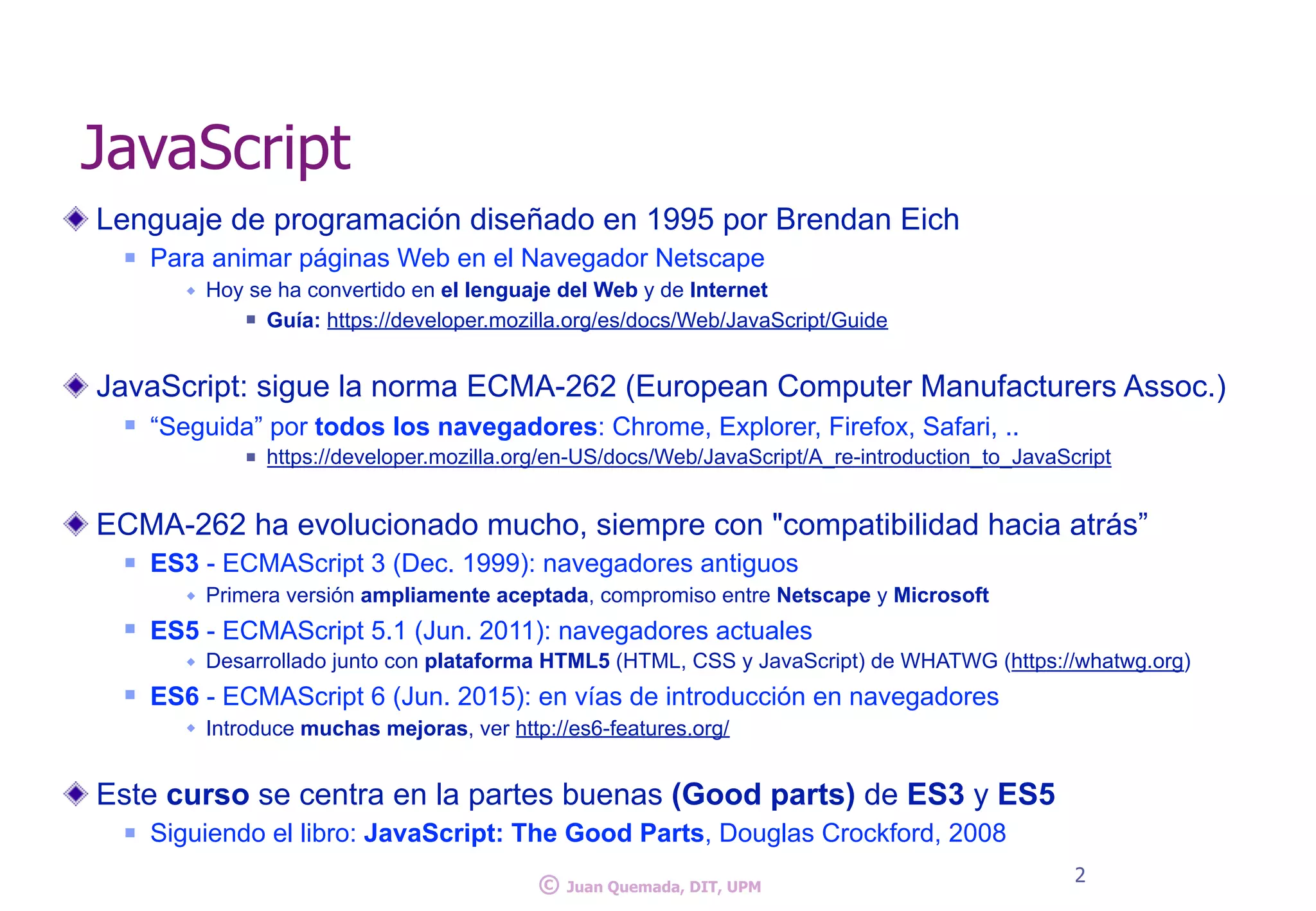 El documento proporciona una introducción al lenguaje de programación JavaScript, incluyendo su historia y desarrollo a través de diferentes versiones de ECMAScript. Se abordan conceptos clave como expresiones, operadores, variables, y la sintaxis utilizada para escribir programas en JavaScript. Además, se destacan aspectos como la conversión de tipos y la sobrecarga de operadores, así como ejemplos de código y la importancia de la estructuración y definición de variables.