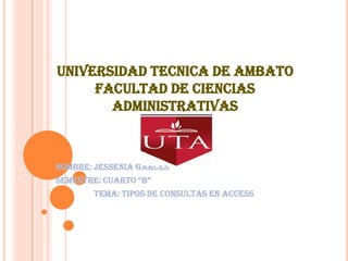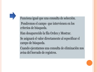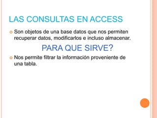 Este documento presenta los cuatro tipos principales de consultas en Access: 1) Consultas de selección, que permiten ver y analizar datos de una o más tablas; 2) Consultas de acción, que realizan cambios a los datos como eliminar o actualizar registros; 3) Consultas de datos anexados, que añaden registros de una tabla a otra; y 4) Consultas SQL, que usan lenguaje SQL para consultar y administrar bases de datos. Explica los pasos para crear cada tipo de consulta.