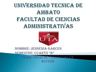 Este documento describe los diferentes tipos de consultas en Access, incluyendo consultas de selección, consultas de acción (eliminación y actualización), consultas de anexión, consultas de creación de tabla y consultas SQL. Las consultas de selección permiten ver y analizar datos de una o más tablas, mientras que las consultas de acción realizan cambios a los registros. Las consultas de anexión agregan registros de una tabla a otra y las consultas de creación de tabla generan una nueva tabla con datos seleccionados. Finalmente, las consultas SQL