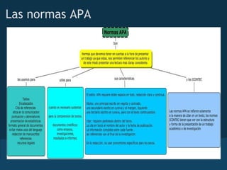 Este documento resume las normas APA y ICONTEC para citar y referenciar fuentes en trabajos escritos. Explica que las normas APA se establecieron en 1929 y han sido actualizadas a través de cinco ediciones para proveer un formato estandarizado. También cubre las normas ICONTEC colombianas y define plagio y fraude académico.