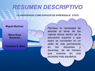 El documento plantea la necesidad de abordar el tema de los valores éticos dentro de la educación superior para que se conviertan en un estilo de vida permanente en los estudiantes y profesores, y así vivir en una sociedad más equitativa. Argumenta que la universidad debe ser un espacio de aprendizaje ético para formar profesionales con vocación y compromiso.
