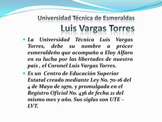 La Universidad Técnica Luis Vargas Torres de Esmeraldas fue creada en 1970 y ofrece estudios de pregrado y posgrado en cinco facultades ubicadas en dos campus. Su misión es formar profesionales comprometidos con el desarrollo local y nacional a través de la docencia, investigación y vinculación con la comunidad.