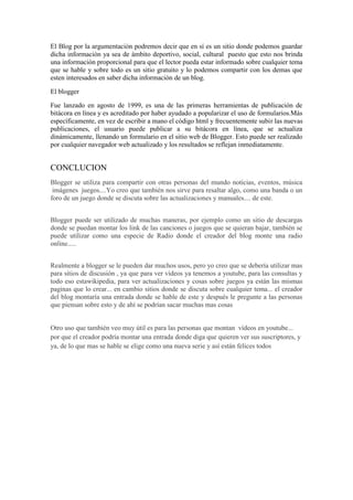 Este documento trata sobre los blogs y la herramienta Blogger. Explica que un blog es un sitio web donde un autor publica información sobre un tema de manera periódica. Los blogs permiten la interacción con los lectores a través de comentarios. Blogger fue lanzado en 1999 y ayudó a popularizar la creación de blogs en línea a través de un formulario sencillo. Los blogs pueden usarse para compartir noticias e información sobre varios temas con otras personas de manera gratuita.