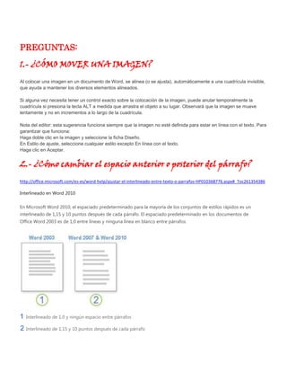 Este documento presenta las respuestas a 4 preguntas sobre el uso de herramientas básicas en Microsoft Word: 1) cómo mover una imagen, 2) cómo cambiar el espacio entre párrafos, 3) cómo cambiar la sangría de un párrafo, y 4) cómo definir una tabulación. Para cada pregunta, se proporcionan instrucciones detalladas con los pasos a seguir para realizar cada acción solicitada.
