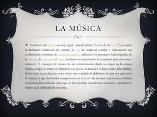 La música se define tradicionalmente como el arte de organizar sonidos y silencios de manera coherente mediante la melodía, armonía y ritmo. Sin embargo, la definición ha evolucionado y hoy en día incluye obras que expanden los límites tradicionales. La música es un producto cultural cuyo fin es suscitar una experiencia estética en el oyente y expresar sentimientos, ideas u otras circunstancias. Actúa como estímulo que afecta la percepción individual y puede cumplir funciones como el entreten