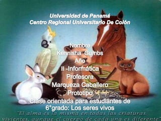 Este documento describe las características de varios grupos de seres vivos, incluyendo insectos, aves, arácnidos, animales invertebrados y plantas con flores. Explica que los insectos tienen cuerpo dividido en cabeza, tórax y abdomen, y respiran a través de tráqueas. Las aves tienen cuerpo cubierto de plumas, alas, y esqueleto ligero. Los arácnidos tienen cuerpo dividido en cefalotórax y abdomen y ocho patas. Los animales invertebrados carecen de columna verte