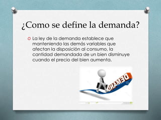 Este documento define conceptos económicos fundamentales como demanda, oferta y equilibrio de mercado. La demanda se define como la cantidad demandada de un bien que disminuye cuando aumenta el precio. La oferta se define como la cantidad de bienes que los productores están dispuestos a ofrecer a diferentes precios. El equilibrio de mercado se produce cuando la cantidad ofrecida es igual a la cantidad demandada a un precio determinado. El documento también explica las curvas de demanda y oferta y cómo se produce el punto de equilibrio cuando ambas curvas se cruzan.