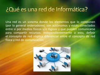Una red es un sistema donde elementos como ordenadores están conectados física o lógicamente para compartir recursos. Las redes pueden ser compartidas cuando un gran número de usuarios comparten recursos, o exclusivas para conectar puntos de forma privada. Las topologías más comunes de una red son en bus, en estrella y en anillo, las cuales definen la forma en que los dispositivos se conectan.