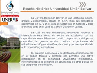 Este documento presenta una reseña histórica y descripción general de la Universidad Simón Bolívar en Venezuela. Fundada en 1967, la USB es reconocida por su excelencia académica y contribuciones científicas. Cuenta con dos sedes y varios institutos y centros de investigación. Su misión es formar líderes comprometidos con la innovación y servicio a la sociedad.
