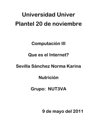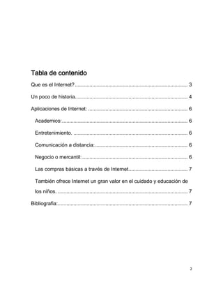 El documento proporciona una introducción al Internet, describiendo brevemente su historia, aplicaciones y funciones. Explica que el Internet es una red de redes que conecta millones de computadoras para compartir información de manera global. Resalta que surgió en la década de 1960 como una red militar estadounidense llamada ARPANET y ha evolucionado hasta convertirse en una plataforma fundamental para la comunicación, el comercio, la educación y el entretenimiento.