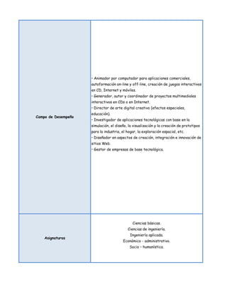 El programa de Ingeniería Multimedia de la Universidad Militar Nueva Granada ofrece una sólida formación en ciencias básicas, ingeniería y habilidades digitales. Los egresados estarán capacitados para trabajar en campos como diseño digital, animación, desarrollo de software y gestión de proyectos multimedia. El programa mantiene convenios con universidades internacionales y ofrece certificaciones en tecnologías de empresas líderes.