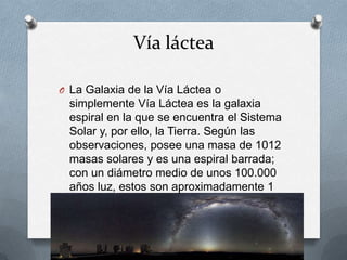 La Vía Láctea es una galaxia espiral masiva que contiene el Sistema Solar y la Tierra. El Sistema Solar consiste en objetos que orbitan alrededor del Sol debido a la gravedad. Las nebulosas son regiones del espacio interestelar compuestas de gas y polvo cósmico donde a menudo nacen nuevas estrellas. Las constelaciones son agrupaciones convencionales de estrellas vinculadas por líneas imaginarias.