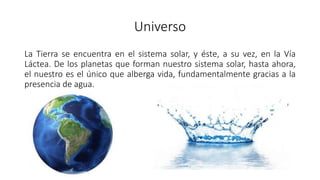 El documento resume los principales componentes del universo. Explica que la Tierra se encuentra en el sistema solar y este en la Vía Láctea. Describe que el universo se originó hace 13,800 millones de años a partir de la Gran Explosión y desde entonces se ha estado expandiendo. Resume los objetos celestes como estrellas, galaxias, agujeros negros y más que componen el universo.