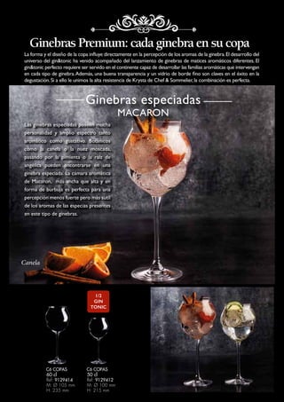 El documento describe la importancia del diseño de copas en la degustación de ginebras, destacando que cada tipo de ginebra se beneficia de un tipo específico de copa para resaltar sus aromas. Se mencionan diferentes categorías de ginebras, como especiadas, herbales, cítricas y florales, junto con sugerencias de copas adecuadas para cada una. Además, se presenta el material Krysta, conocido por su resistencia, brillo y transparencia, ideal para la presentación de estas bebidas.