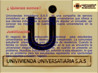 Este documento describe una empresa llamada Univiviendas Inmobiliaria S.A.S. que ofrece arriendos de habitaciones para estudiantes universitarios. La empresa busca llenar una necesidad en el mercado de vivienda para estudiantes al construir diferentes tipos de habitaciones cerca de universidades a precios accesibles para los estudiantes. La empresa se enfocará inicialmente en la ciudad de Bucaramanga.