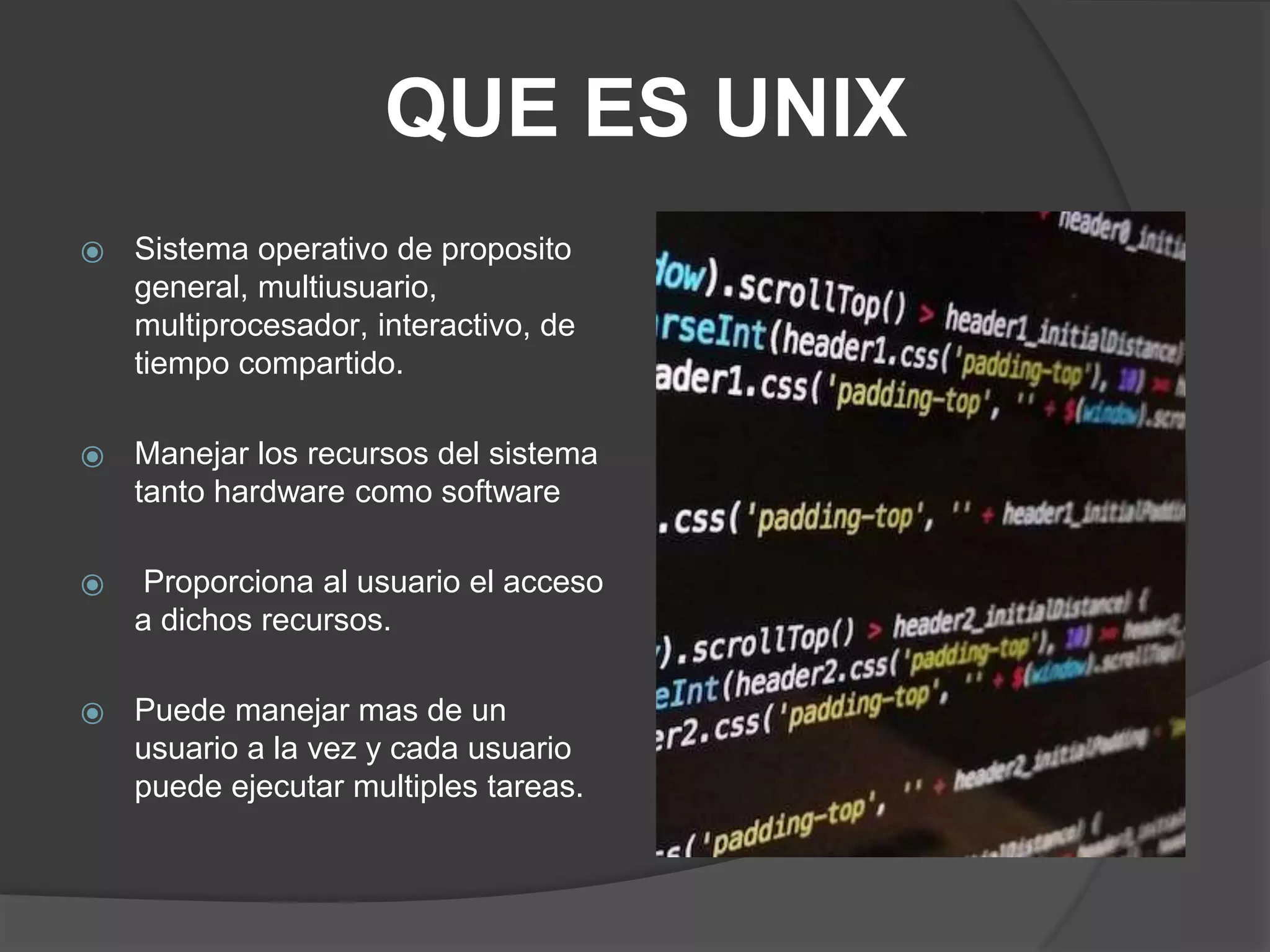 Unix es un sistema operativo multiusuario y multiprocesador desarrollado originalmente en los Bell Laboratories. Fue uno de los primeros sistemas operativos escritos en lenguaje C, lo que permitió su portabilidad a diferentes plataformas hardware. Versiones posteriores como BSD de la Universidad de California en Berkeley contribuyeron a su popularidad y uso comercial en la década de 1980.