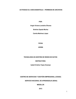 Este documento describe 7 procedimientos para administrar permisos de archivos y directorios en Unix. Estos incluyen explorar permisos de archivos creados, crear archivos privados, determinar grupos de usuarios, crear directorios públicos para diferentes grupos, proteger subdirectorios, manejar permisos de grupos de archivos y cambiar el propietario de un archivo. El objetivo es comprender cómo brindar o quitar acceso a archivos y directorios mediante el uso de permisos y grupos de usuarios en Unix.