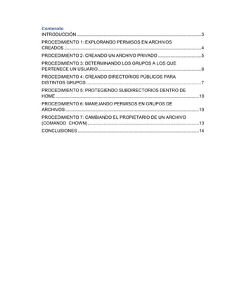 Este documento describe 7 procedimientos para administrar permisos de archivos en Linux. Estos incluyen explorar permisos de archivos creados, crear archivos privados y públicos, proteger subdirectorios, manejar permisos de grupos de archivos, y cambiar el propietario de archivos. El objetivo es enseñar los conceptos básicos de permisos de archivos y cómo asignarlos correctamente para compartir archivos de manera segura entre usuarios y grupos.