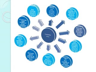 Este documento lista y describe comandos básicos de Linux y Unix como ls, pwd, rm, mv, cp, clear, man, more, cat y echo. ls muestra el contenido de un directorio, pwd muestra el directorio de trabajo actual, rm borra ficheros, mv mueve ficheros, y cp copia ficheros y directorios. clear borra la pantalla, man muestra la página del manual de un comando, y more y cat muestran el contenido de un fichero de manera paginada o completa respectivamente.