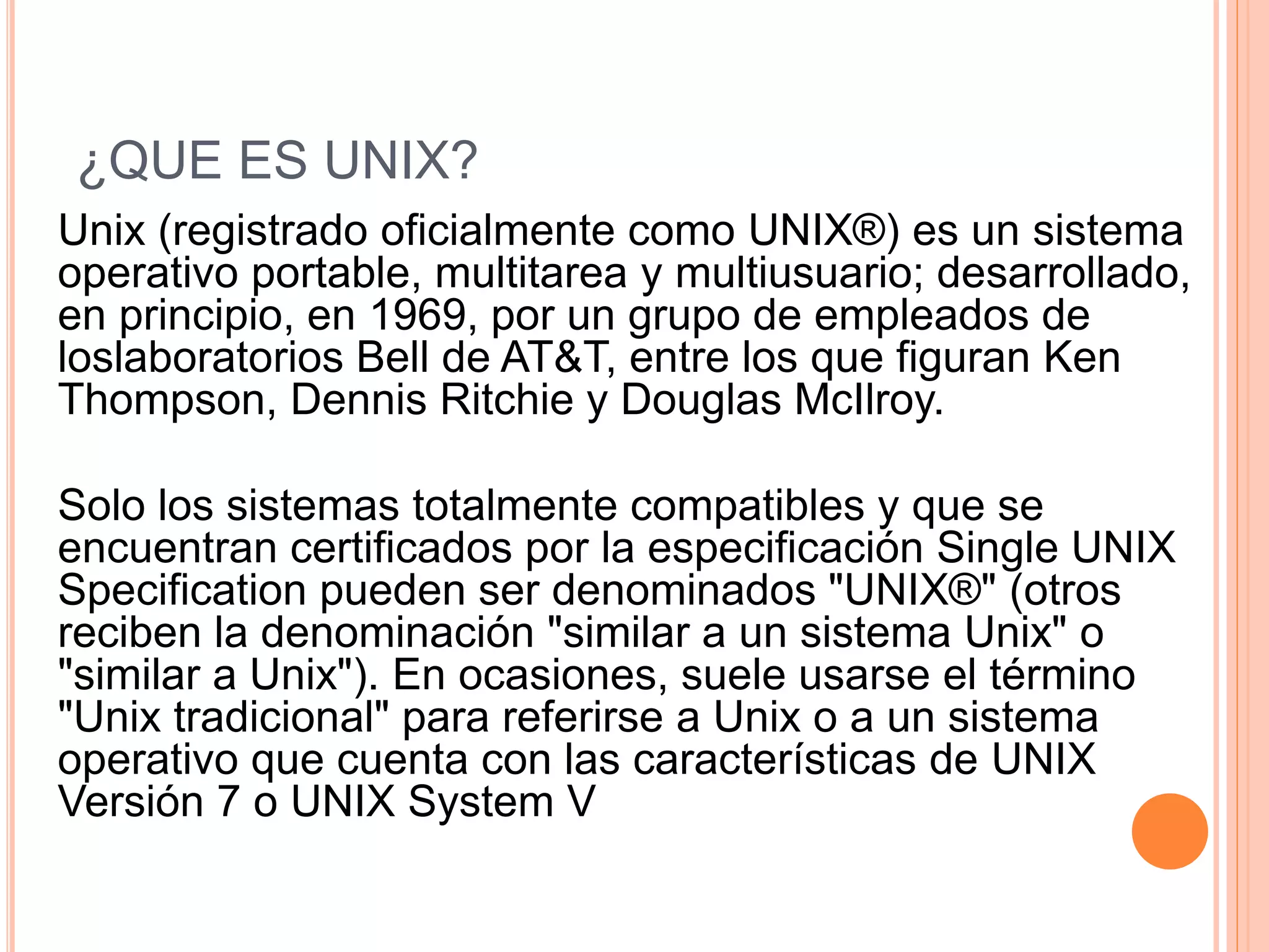 El documento describe brevemente el sistema operativo Unix. Se creó en 1969 por investigadores de Bell Labs y ha evolucionado desde entonces a través de múltiples versiones. Es un sistema operativo portable, multitarea y multiusuario diseñado para ser flexible y potente. Proporciona servicios comunes a través de llamadas al sistema para programas de aplicaciones.