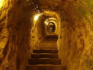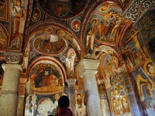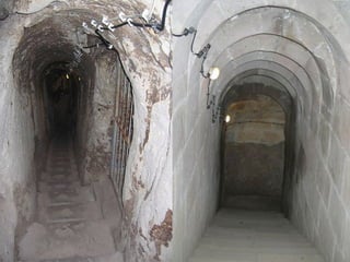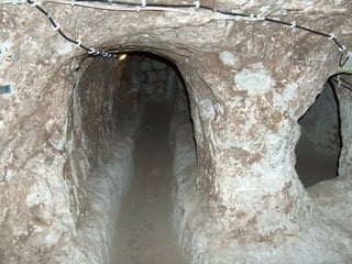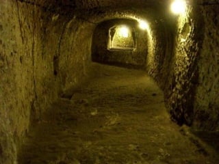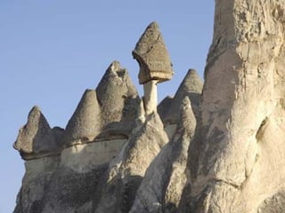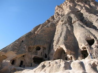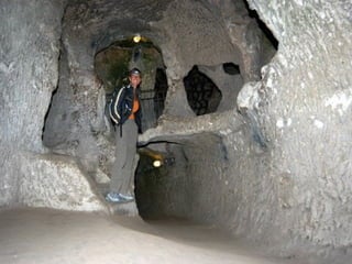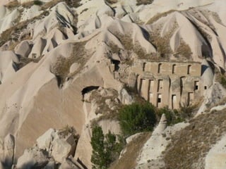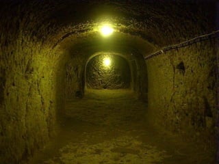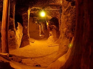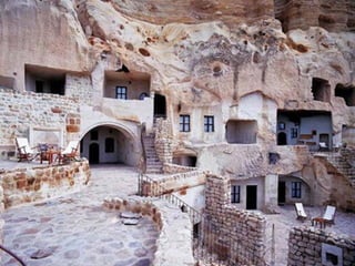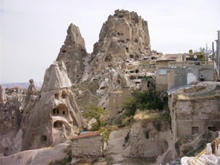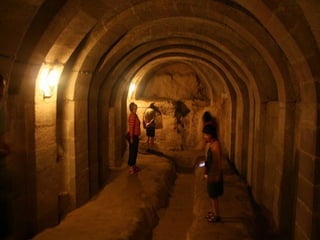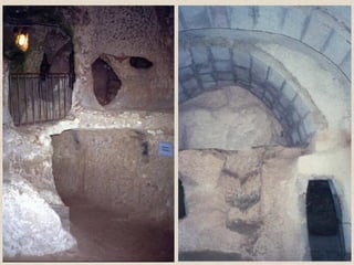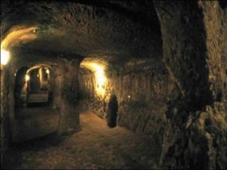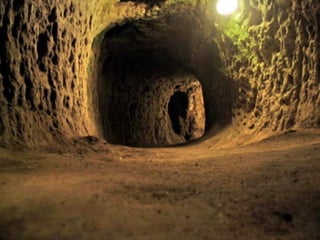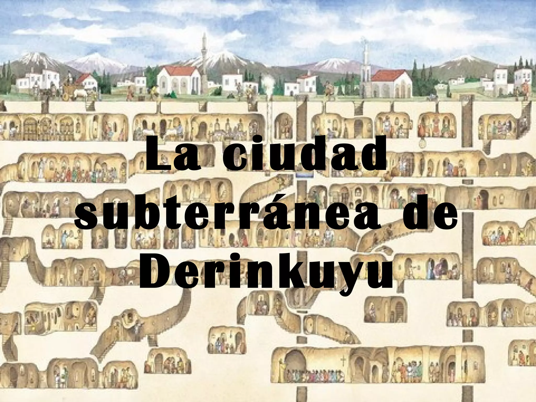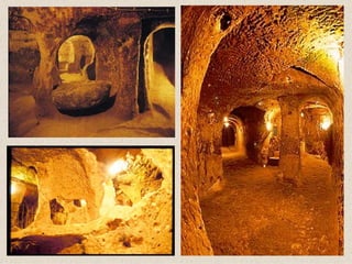 Derinkuyu es una ciudad subterránea abandonada en Capadocia, Turquía que data del siglo VII a.C. Fue descubierta accidentalmente en 1963 y contiene 20 niveles excavados en la roca que alojaban hasta 10,000 personas, con estancias como cocinas, iglesias, almacenes y más. La ciudad servía como refugio durante invasiones gracias a su diseño fortificado con puertas de piedra y túneles de escape.