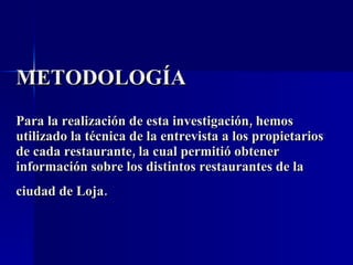 Este documento resume los resultados de una investigación sobre la historia de los restaurantes en la ciudad de Loja, Ecuador. Se entrevistó a los propietarios de 12 restaurantes para obtener información sobre su antigüedad, número de clientes, reconocimiento, calidad del servicio y afiliaciones. Los restaurantes más antiguos tienen entre 45 y 38 años. Algunos son conocidos a nivel nacional, mientras que otros solo son conocidos localmente. La calidad del servicio varía entre los restaurantes.