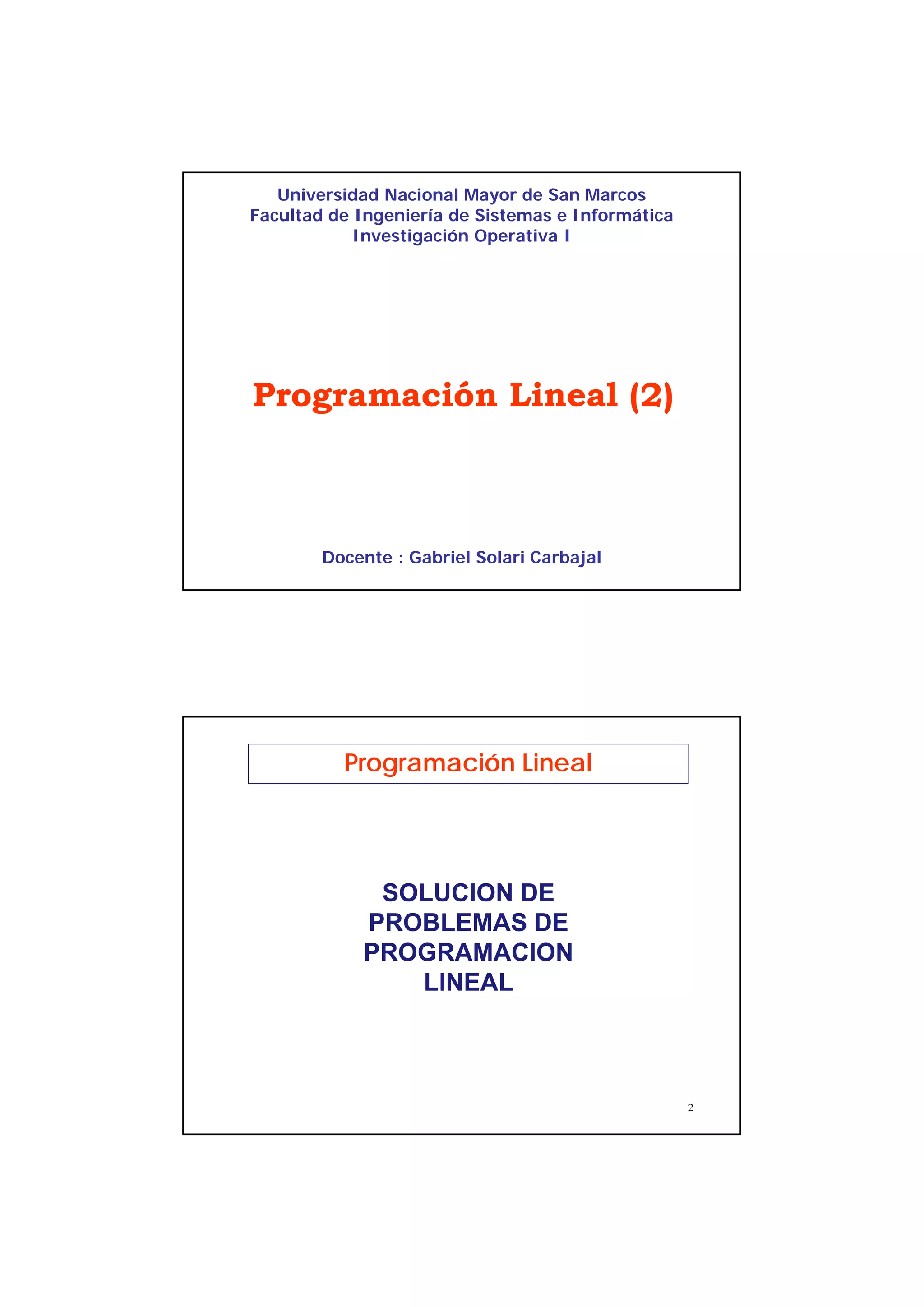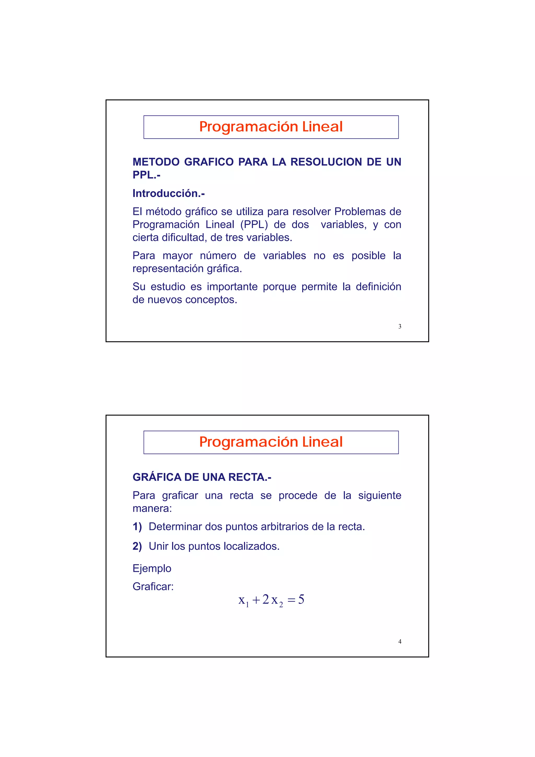 El documento describe el método gráfico y el método simplex para resolver problemas de programación lineal. El método gráfico involucra graficar las restricciones y la función objetivo para determinar la región factible y la solución óptima. El método simplex transforma el problema a una forma estándar y usa tablas y pivotes para iterativamente encontrar la solución óptima. El documento también presenta el software GLP para graficar problemas de programación lineal de dos variables.