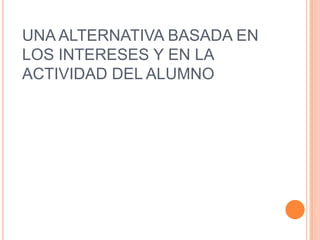Este documento propone un método de aprendizaje basado en los intereses y la actividad del alumno a través de rincones de trabajo, rincones de juego y talleres. Los rincones de trabajo fomentan la actividad individual mientras que los rincones de juego satisfacen las necesidades lúdicas de los niños. Los talleres permiten el trabajo en grupo y el aprendizaje tanto individual como colectivo. El documento ofrece recomendaciones para la organización efectiva de los talleres, incluyendo el análisis de objetivos, la sele