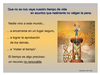 El documento habla sobre aprovechar el tiempo de forma valiosa viviendo cada día intensamente. Recomienda dejar atrás actitudes viejas para abrirse a lo nuevo, cerrar asuntos pendientes del pasado, pedir y dar ayuda cuando sea necesario, y estar abiertos al encuentro con otros para no aislarse de la vida. El objetivo es celebrar cada día como un nuevo comienzo y vivir plenamente en el presente.