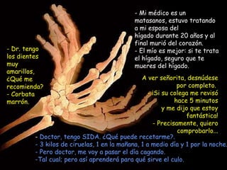 El documento contiene varios chistes sobre médicos y situaciones médicas. Algunos chistes tratan sobre médicos ineptos, diagnósticos absurdos, y conversaciones cómicas entre médicos y pacientes. Otros chistes juegan con dobles sentidos o malentendidos. En general, el documento usa el humor para satirizar en forma ligera algunos aspectos del sistema de salud.