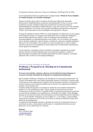El documento resume varios eventos que tendrán lugar en la Universidad Nacional de San Luis entre el 2 y el 13 de septiembre, incluyendo una marcha contra la impunidad, una charla de Emilio Scotto, un seminario sobre nuevos péptidos antifúngicos, un trayecto de postgrado sobre comunicación institucional, y una conferencia sobre el italiano en los diarios. También anuncia el inicio de un programa de reciclaje de equipos informáticos y la entrega de diplomas a un curso de diseño y decoración de interiores.