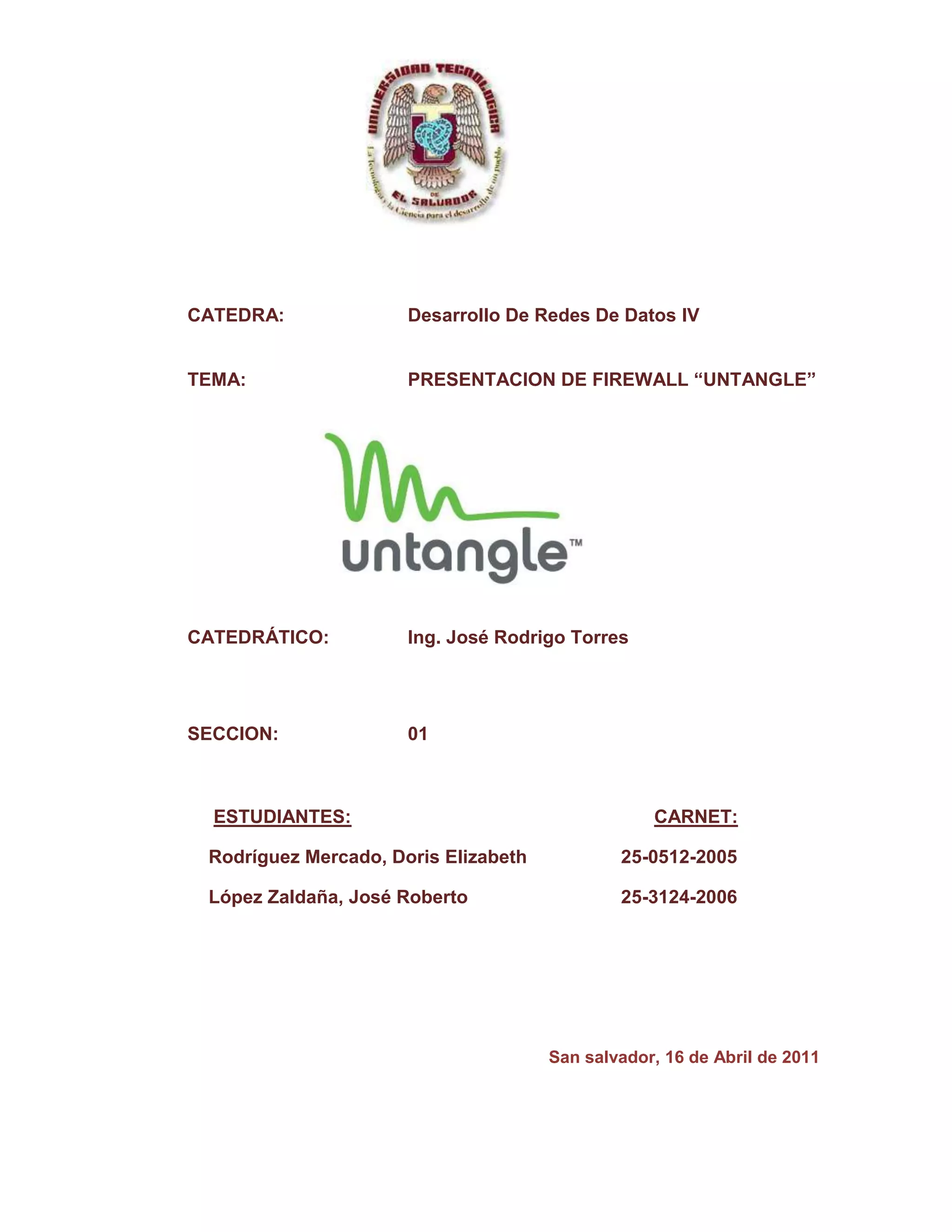 Este documento presenta Untangle, una plataforma de software de código abierto que permite desplegar aplicaciones de seguridad de red como firewall, antivirus, filtrado web y monitoreo de red. Explica la historia de la compañía Untangle, sus fundadores y su misión de hacer que la implementación de infraestructura de TI sea más simple y económica para las pequeñas empresas a través del uso de métodos de código abierto. También proporciona instrucciones para instalar y configurar Untangle, así como una tabla que resume la compatibilidad de hardware