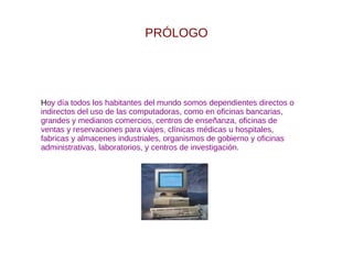 Las computadoras han invadido la mayoría de las actividades humanas y se usan en bancos, comercios, escuelas, viajes, medicina, industrias, gobierno y más. La primera generación de computadoras (1951-1958) usó bulbos para procesar información ingresada por tarjetas perforadas. La segunda generación (1959-1964) fue más rápida y pequeña debido al transistor, aunque el costo seguía siendo alto.