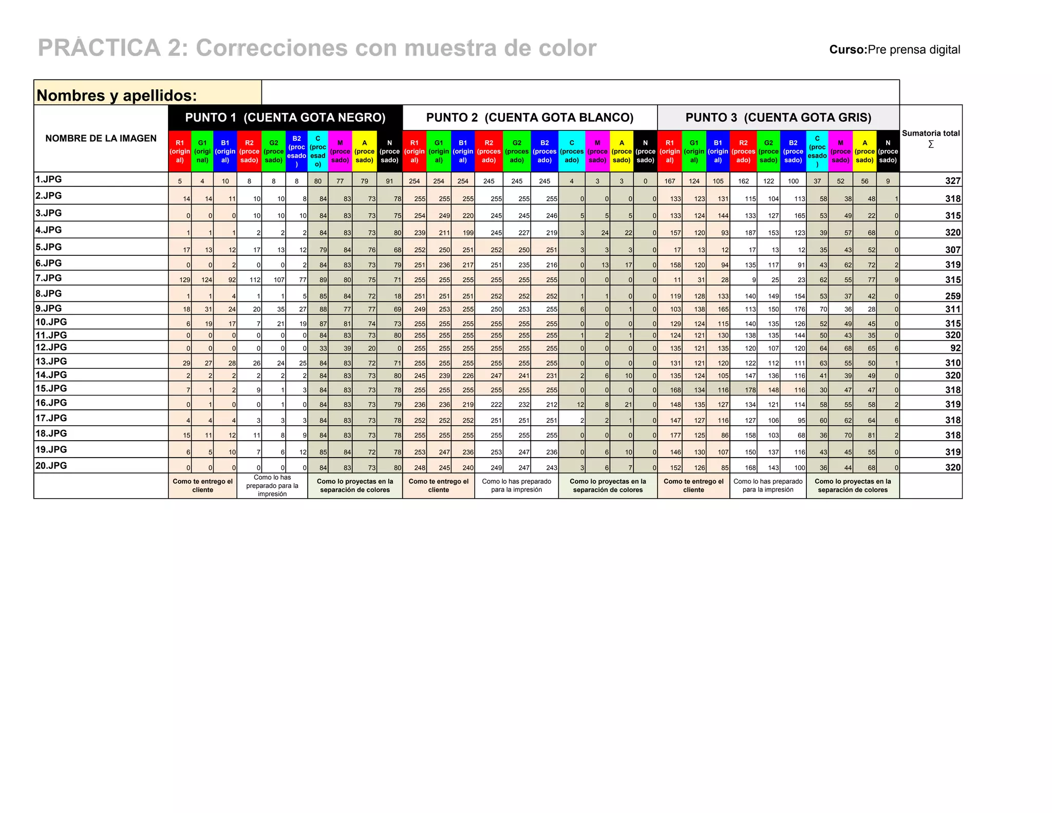 El documento presenta los valores de cuentagotas de color para 20 imágenes en 3 puntos de control (negro, blanco y gris). Los valores miden la incidencia de la tinta CMYN en cada punto para cada imagen original, como se entregó al cliente y como fue preparada para impresión.