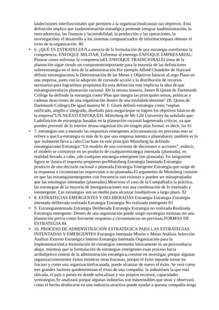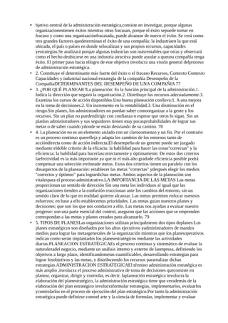 El documento discute los conceptos clave de la administración estratégica, incluyendo factores que determinan el éxito de una compañía, tipos de planes, estrategias intencionales vs. emergentes. Explica que el objetivo central es investigar por qué algunas organizaciones tienen éxito mientras otras fracasan, y que tres grandes factores influyen: la industria, el país o países donde se ubican, y los propios recursos, capacidades y estrategias de una compañía.